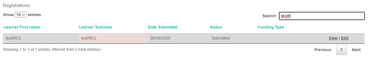 - The table shows the leaners registration details, including their first name, surname, the date the application was submitted, the status of the application. and their funding type.