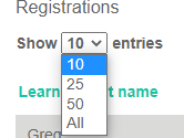 - You can alter the number of entries shown to 10,25,50 or All by clicking the drop-down tab between Show and entries and clicking your desired value.