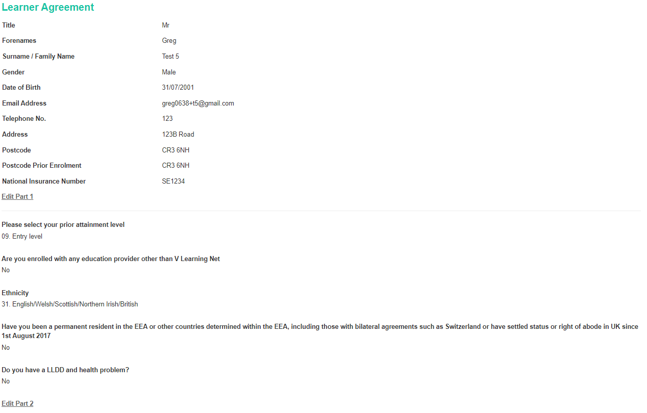 - Click the View | Edit on the desired user to bring up the following Learner Agreement and Declaration
