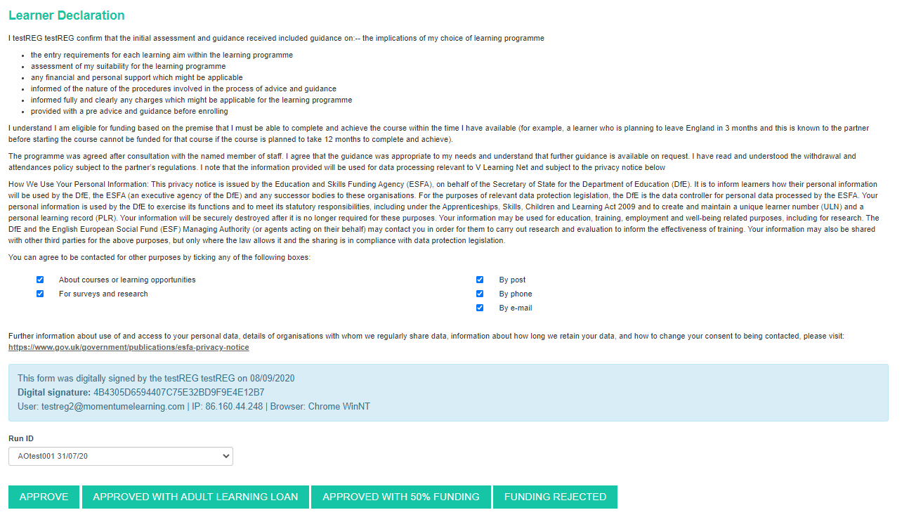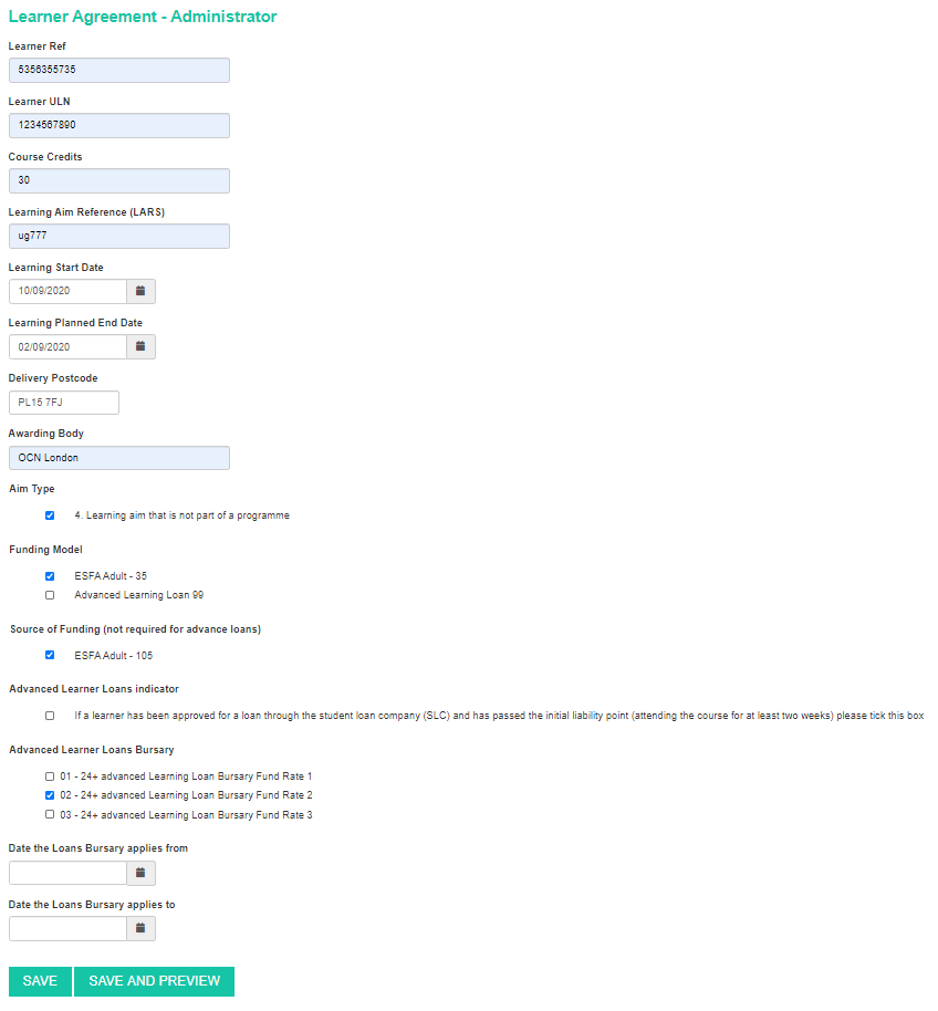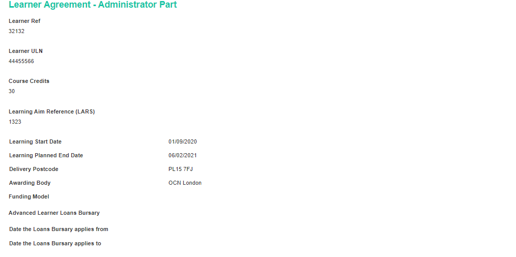 (the Admin then completed the Adult Learning Loan administration outside of the e-Portfolio)