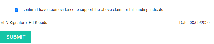 - This generates a page with a review of the answers and the tik box below. The administrator must click the box if they have seen evidence to support the above claim for full funding indicator, to confirm the registration. The administrator should then click the SUBMIT button.