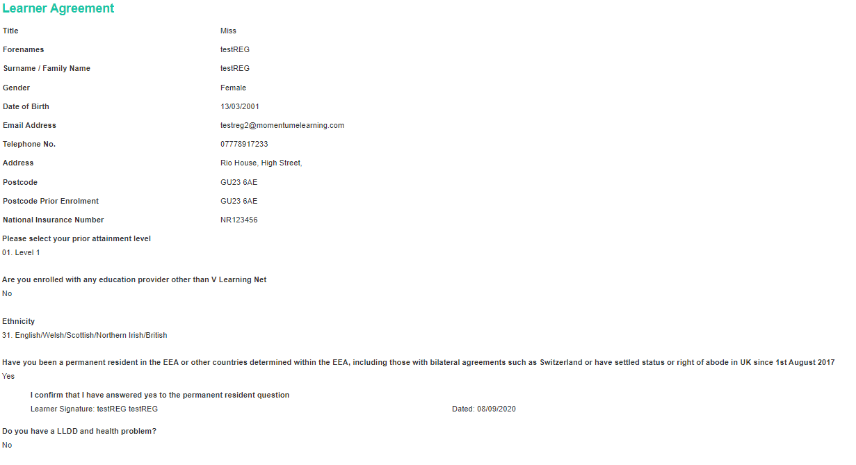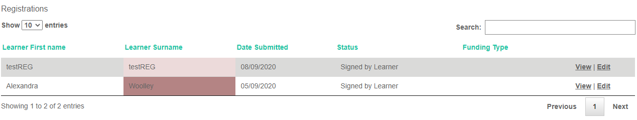 - Once the learner has signed their declaration they will appear in the SIGNED REGISTRATIONS section.