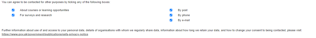 - Click the tick boxes to select what purposes you want to be contact for, and by what means (ie by post, phone or e-mail).