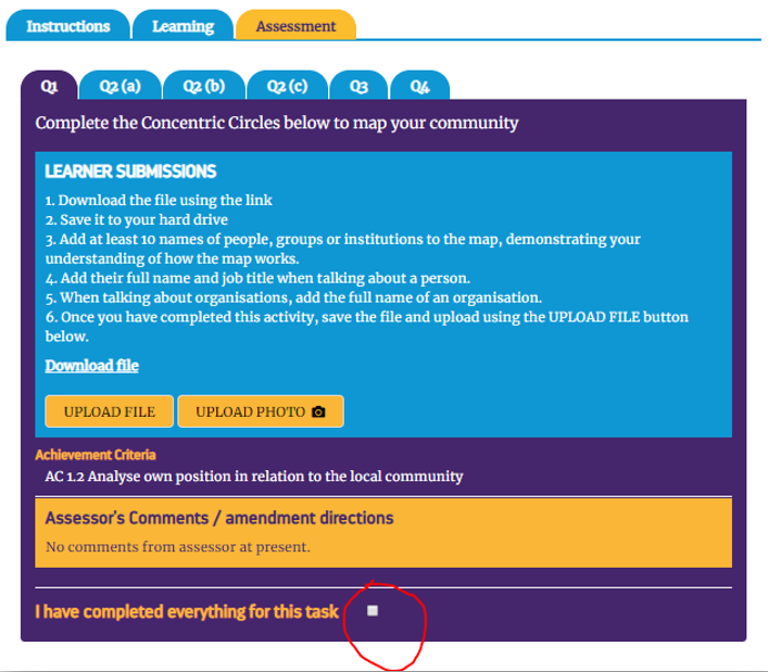When each Assessment Task is complete, it is important that the small, tick box at the foot of the screen, labelled ‘I have completed everything for this task’ and circled in red in the image, is ticked. If not the Tasks cannot be ‘submitted’.