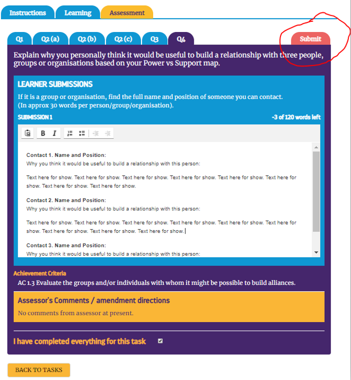 Click on this tab to submit your work to the Tutor/Assessor, so that it can be assessed.